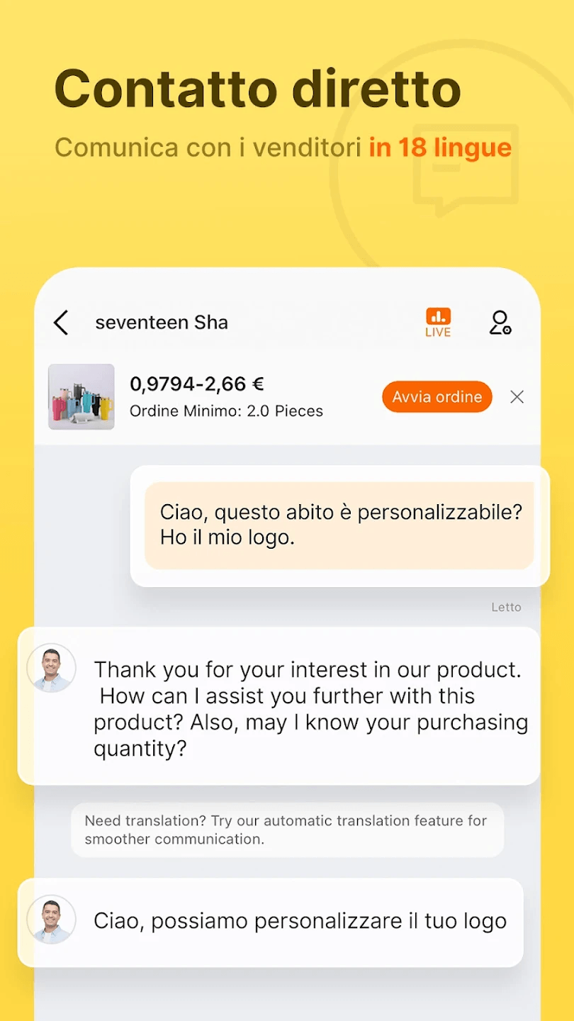 Su Alibaba.com non sei limitato all’uso dell’app in inglese o cinese. Lo strumento supporta 16 lingue và offre la conversione automatica della valuta per oltre 140 divise diverse. Inoltre, collegando la tua e-mail, riceverai offerte esclusive và promozioni dai migliori produttori và venditori.