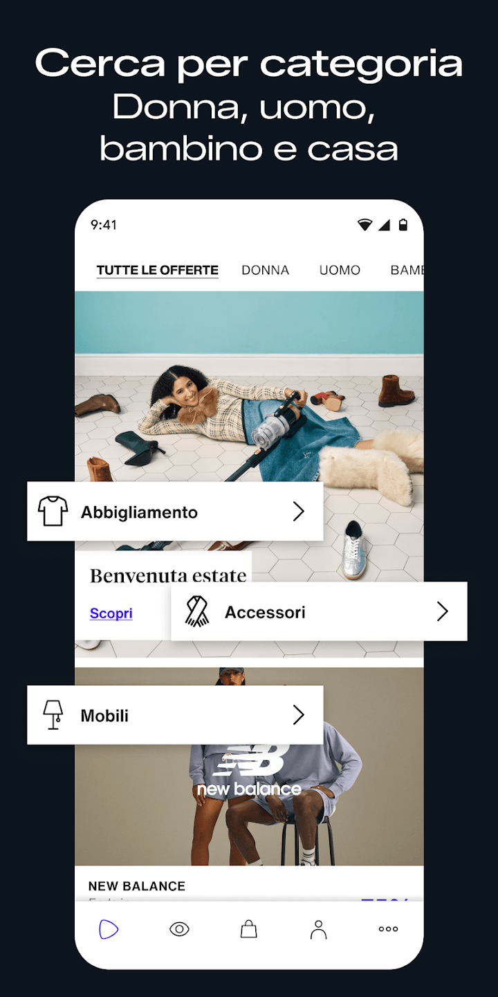 Dopo aver installato l’app, ti basta registrarti o accedere per iniziare a navigare tra le varie categorie. Tra le principali sezioni trovi: